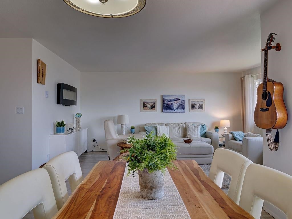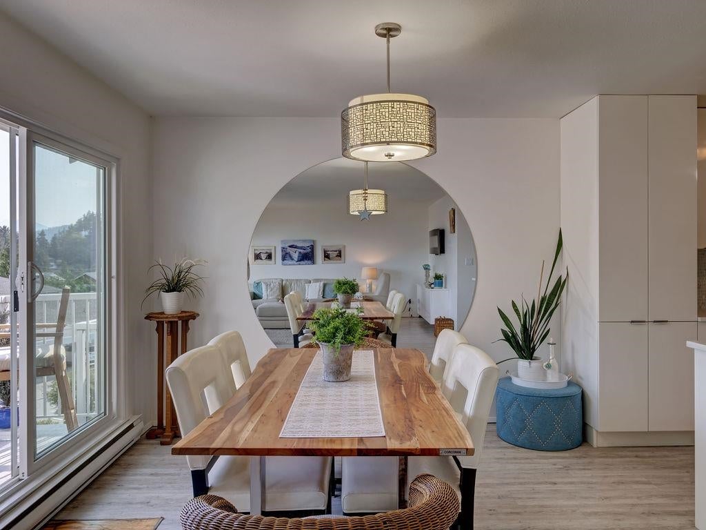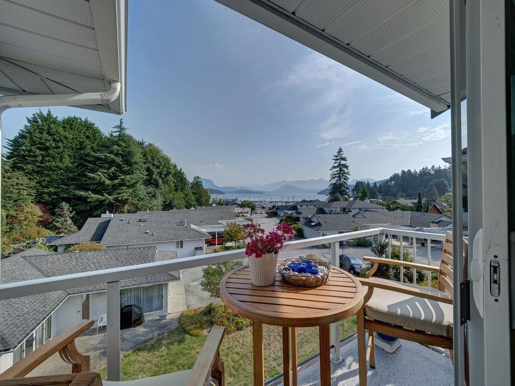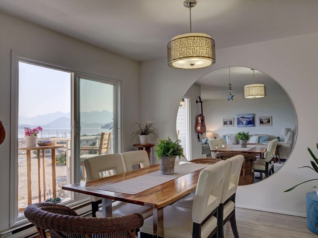 Upon entry, you're welcomed by panoramic ocean, marina, and mountain views from the open-concept living space of this beautifully updated top-floor unit in sought-after Marina Place, Lower Gibsons. Just steps from the Public Market, beaches, and village centre, this home offers easy, walkable living in a quiet 55+ community. The kitchen has been reimagined with custom Merit cabinetry, quartz counters, and open sightlines for entertaining. The flexible second bedroom is ideal as a den, office and/or guest space — currently open with no closet, but features two areas, one with a skylight. All-new windows (2024), newer hot water tank, fully renovated ensuite, newer washer/dryer, and commercial-grade vinyl plank flooring throughout. Two patios complete this move-in-ready gem. Shows 10/10.