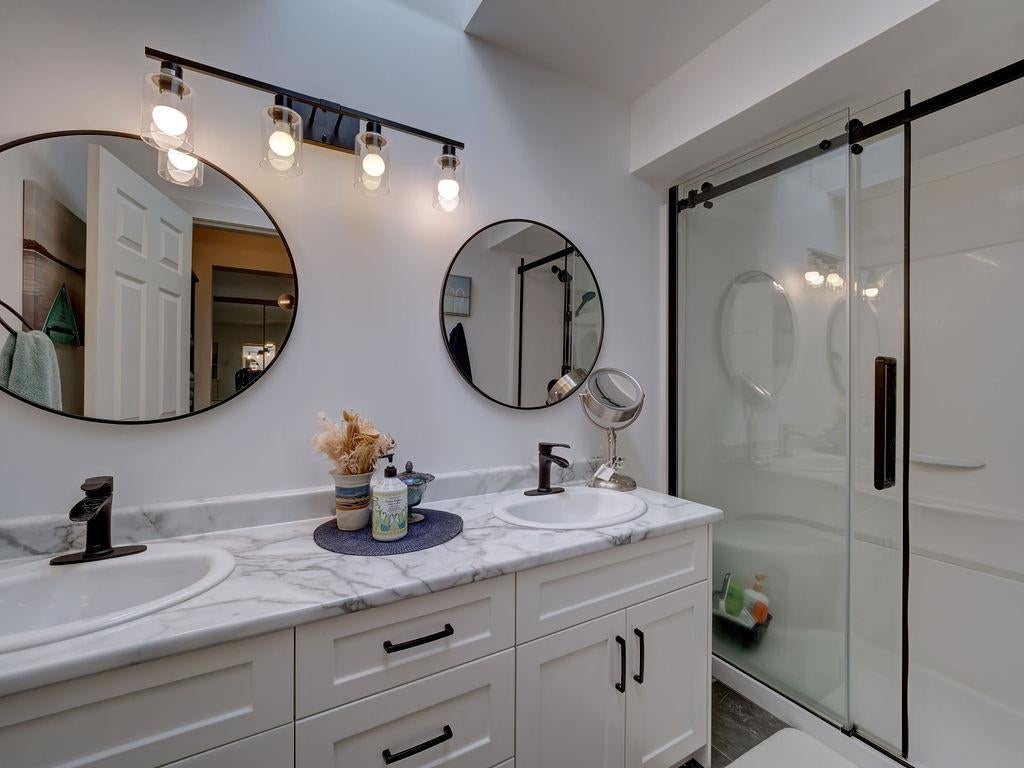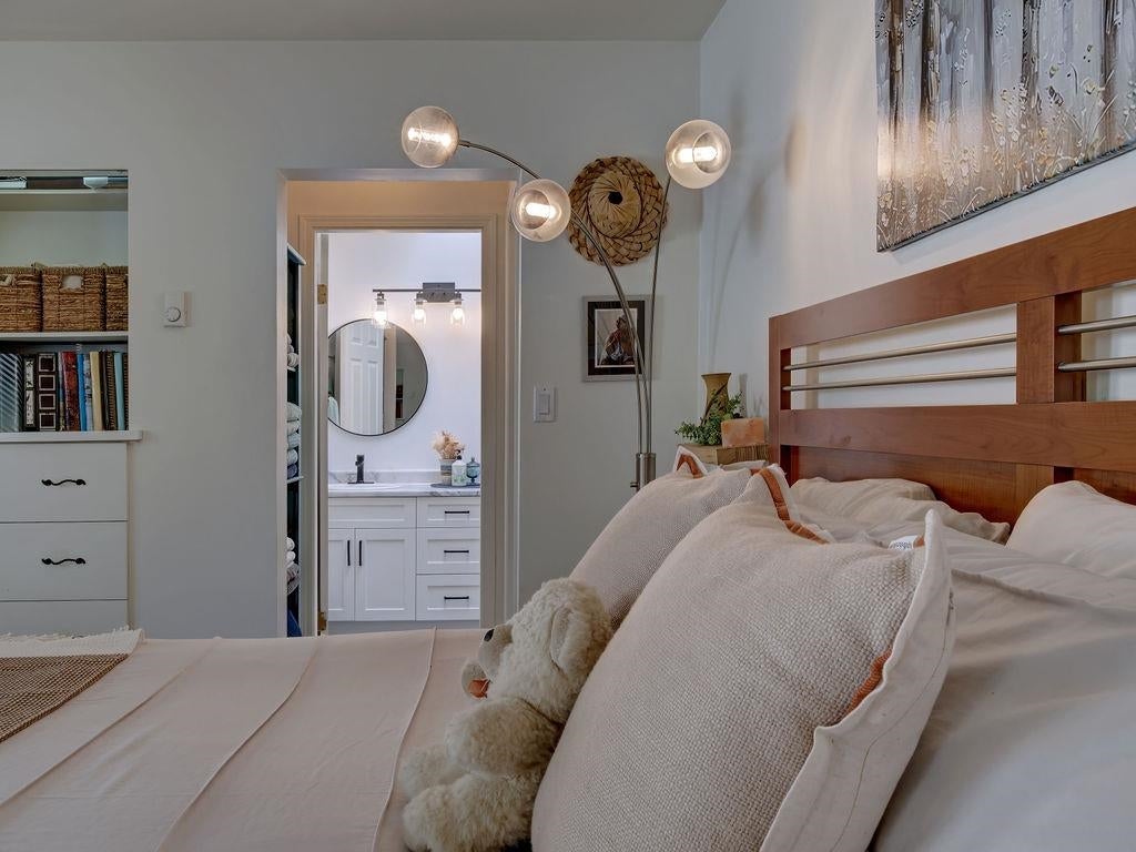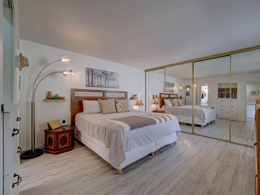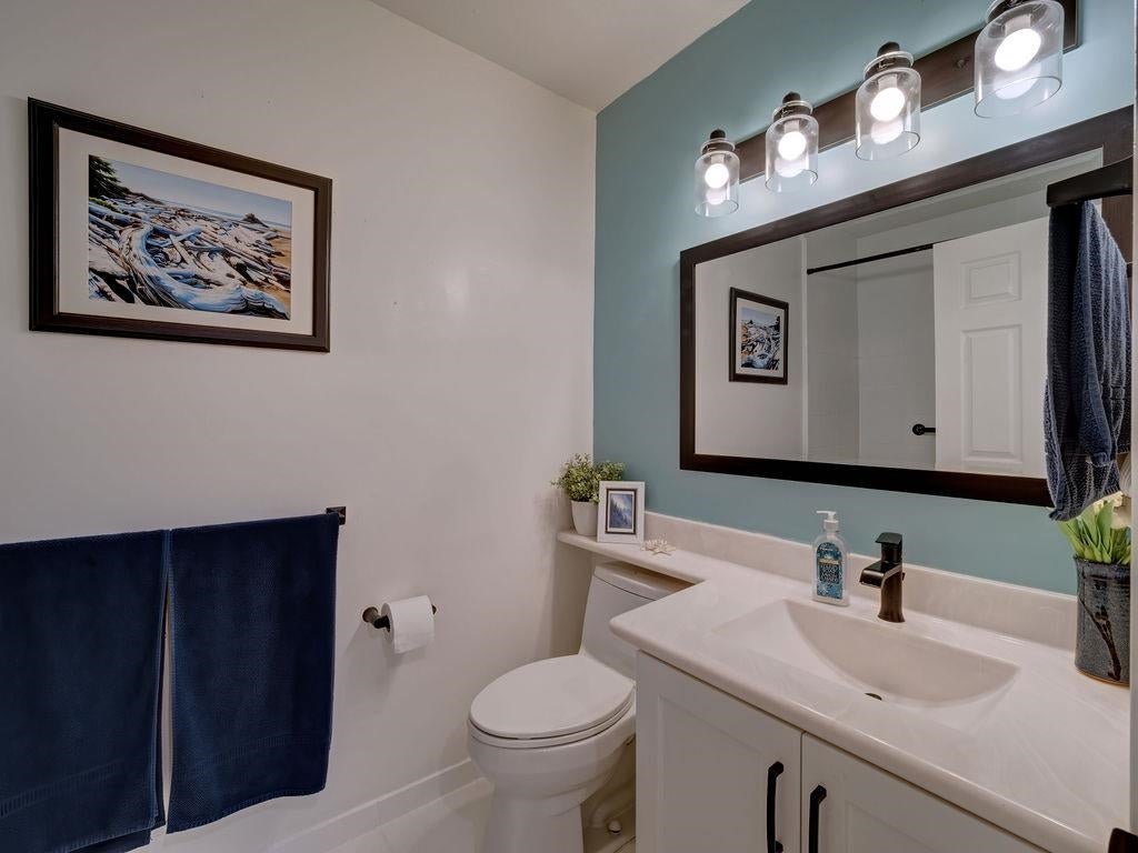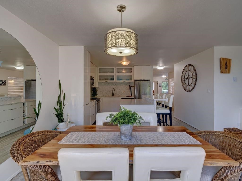 Upon entry, you're welcomed by panoramic ocean, marina, and mountain views from the open-concept living space of this beautifully updated top-floor unit in sought-after Marina Place, Lower Gibsons. Just steps from the Public Market, beaches, and village centre, this home offers easy, walkable living in a quiet 55+ community. The kitchen has been reimagined with custom Merit cabinetry, quartz counters, and open sightlines for entertaining. The flexible second bedroom is ideal as a den, office and/or guest space — currently open with no closet, but features two areas, one with a skylight. All-new windows (2024), newer hot water tank, fully renovated ensuite, newer washer/dryer, and commercial-grade vinyl plank flooring throughout. Two patios complete this move-in-ready gem. Shows 10/10.