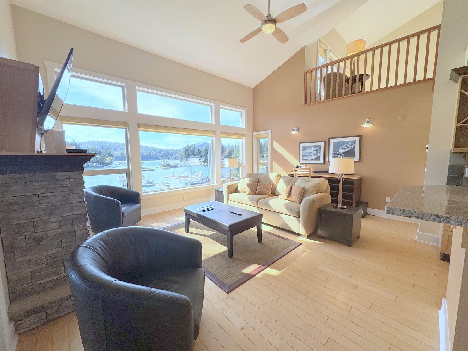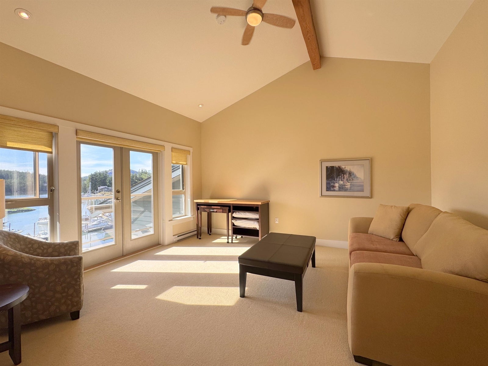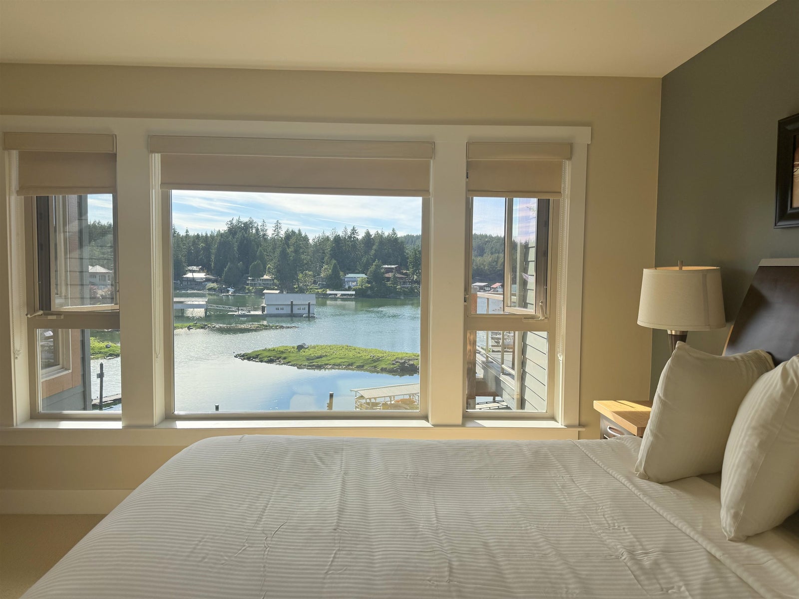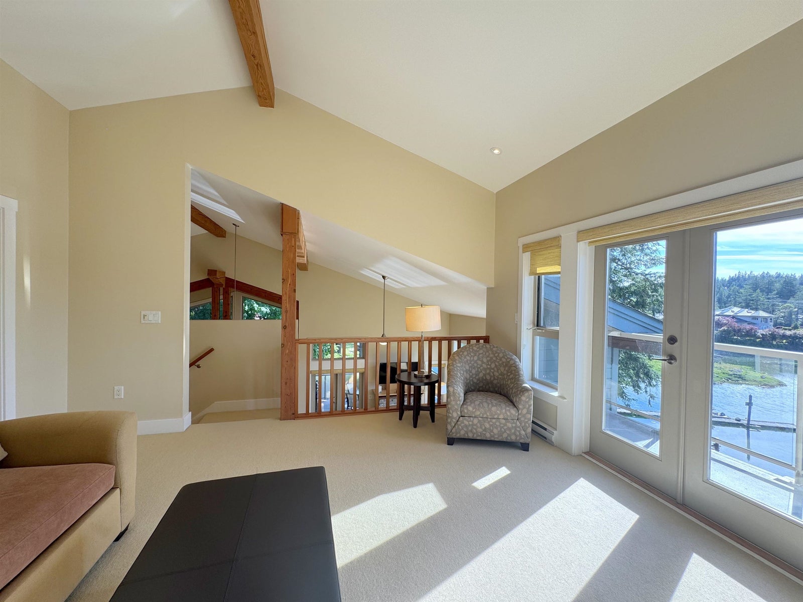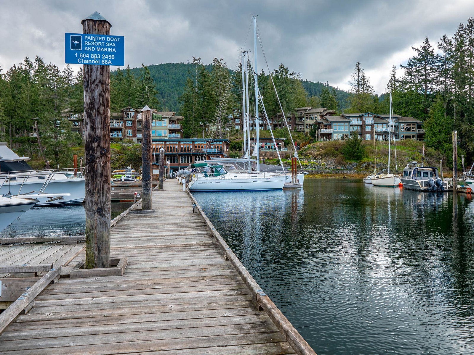 Enjoy well deserved downtime in your pivate villa at the Painted Boat Resort & Spa. This waterfront development sits on over 5 acres of beautifully maintained grounds including an outdoor infinity pool, hot tub and exercise facility overlooking the active bay and marina. This wheelchair friendly villa is uniquely located tucked away at the end of the property overlooking the lagoon and an awesome view of Pender Harbour * Upper floor & corner boasting 2 bdrms on the main level and upper loft overlooking wood beams and vaulted ceilings. First class restaurant on site and a short stroll to quaint Madeira Park for supplies. Invest in YOUR LIFESTYLE and recoup some expenses through rental pool. Fees incl ALL COST OF OWNERSHIP including taxes, insurance, utilities & all furnishings & equipment.